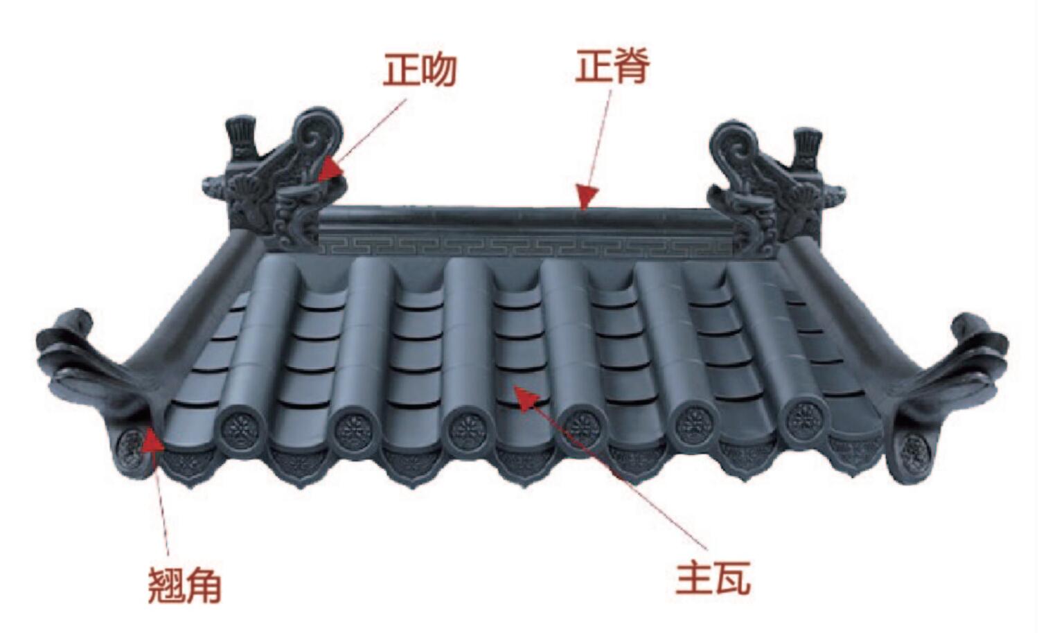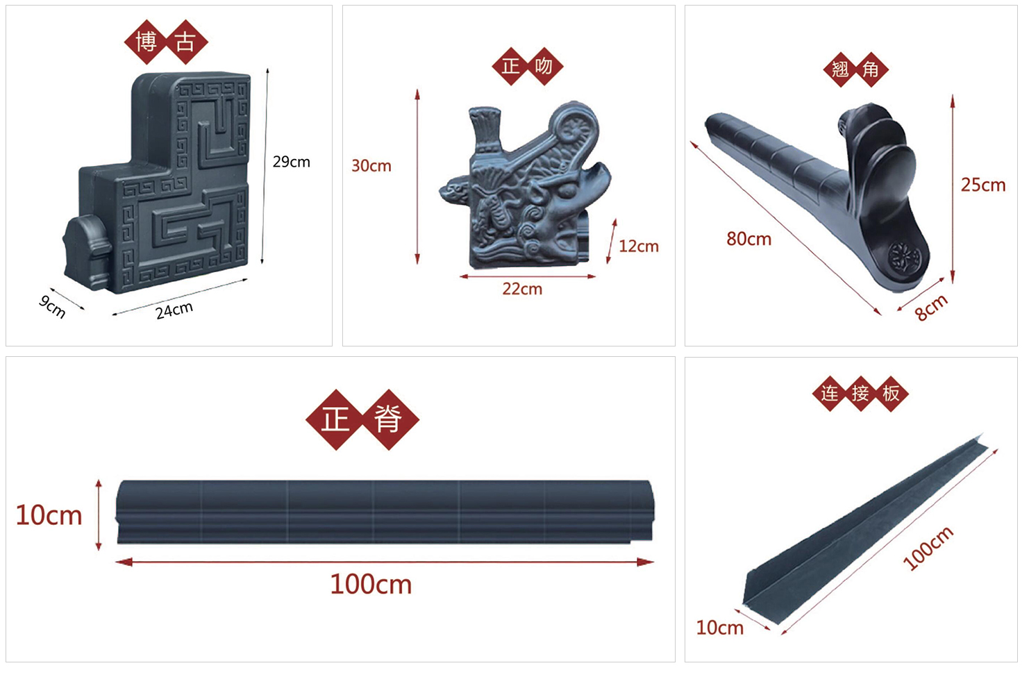 上段、中段、下段下端、正吻博古祥云翘、凤尾翘祥云正脊、普通正脊连接板